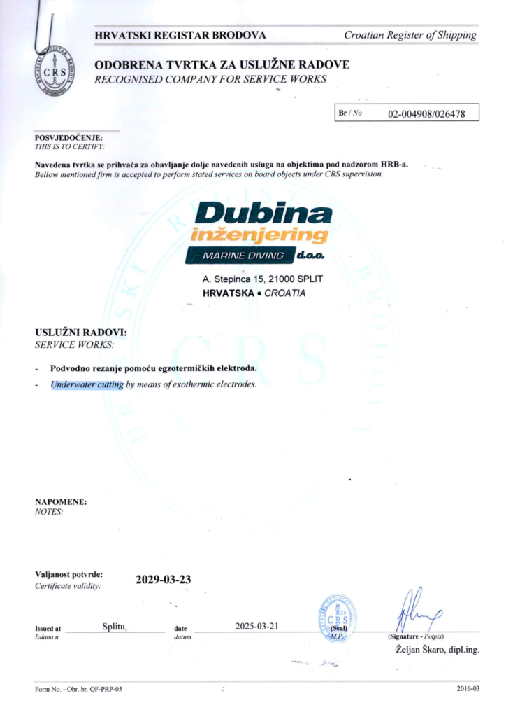 We are a company specialised in underwater works. Founded in 2000 under the leadership of diving instructor Gordan Z., who has been professionally engaged in underwater operations since 1996.