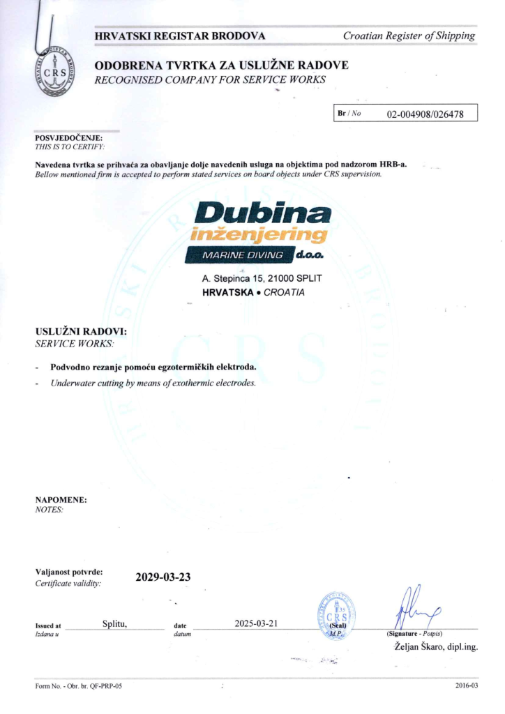 We are a company specialised in underwater works. Founded in 2000 under the leadership of diving instructor Gordan Z., who has been professionally engaged in underwater operations since 1996.